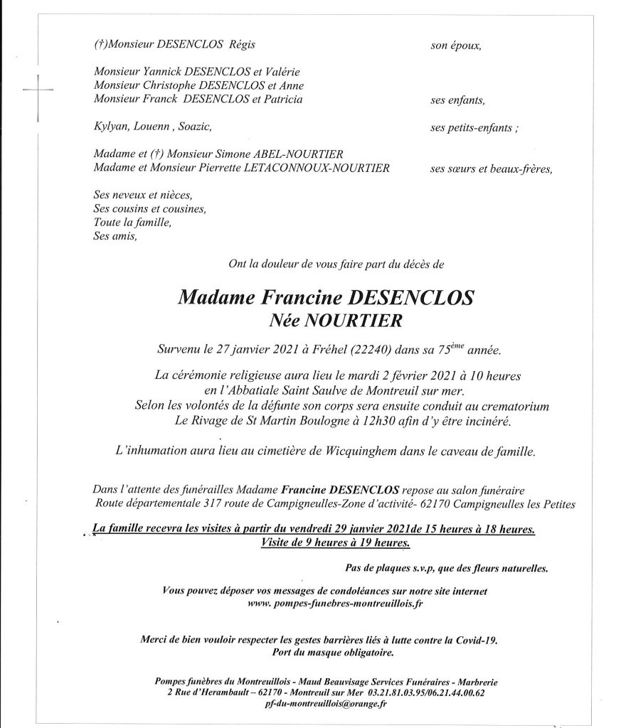 Assure les enfants et belles-filles, les chers petits-enfants de madame Francine Desenclos de leur plus grande sympathie en ces moments extrêmement difficiles.