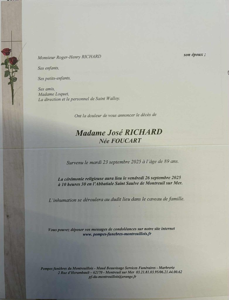 Recevez Monsieur le Docteur Richard ainsi que vos proches, les condoléances de la famille Bertaux et Seynhaeve de Wattrelos . Nous vous souhaitons bon courage pour accepter le départ de votre épouse, que mes parents avaient eu l’occasion de rencontrer lors de votre départ en retraite.