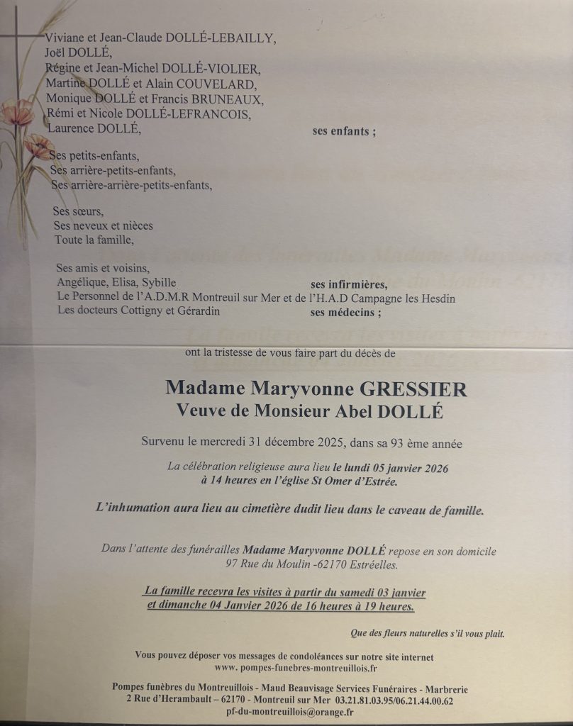 N’ayant pu assister aux obsèques de Madame Dollé, Danielle Bibloque et l’ensemble du personnel de l’ADMR du Pays de Montreuil s’associent à votre peine et vous prient d’accepter leurs sincères condoléances