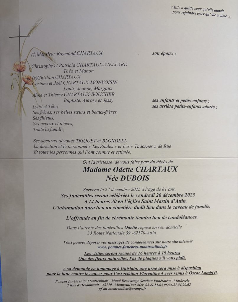 Odette va reposer en paix près de Raymond et Ghislain. Nous vous embrassons.