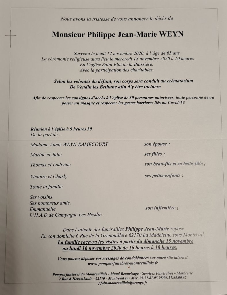 Nous sommes attristés par le décès de Mr Weyn qui s’est battu contre la maladie avec courage et volonté de guérir. Nous présentons à Annie et à toute sa famille et ses nombreux amis nos sincères condoléances. Véronique. Étienne et leurs enfants du Vieux Logis.